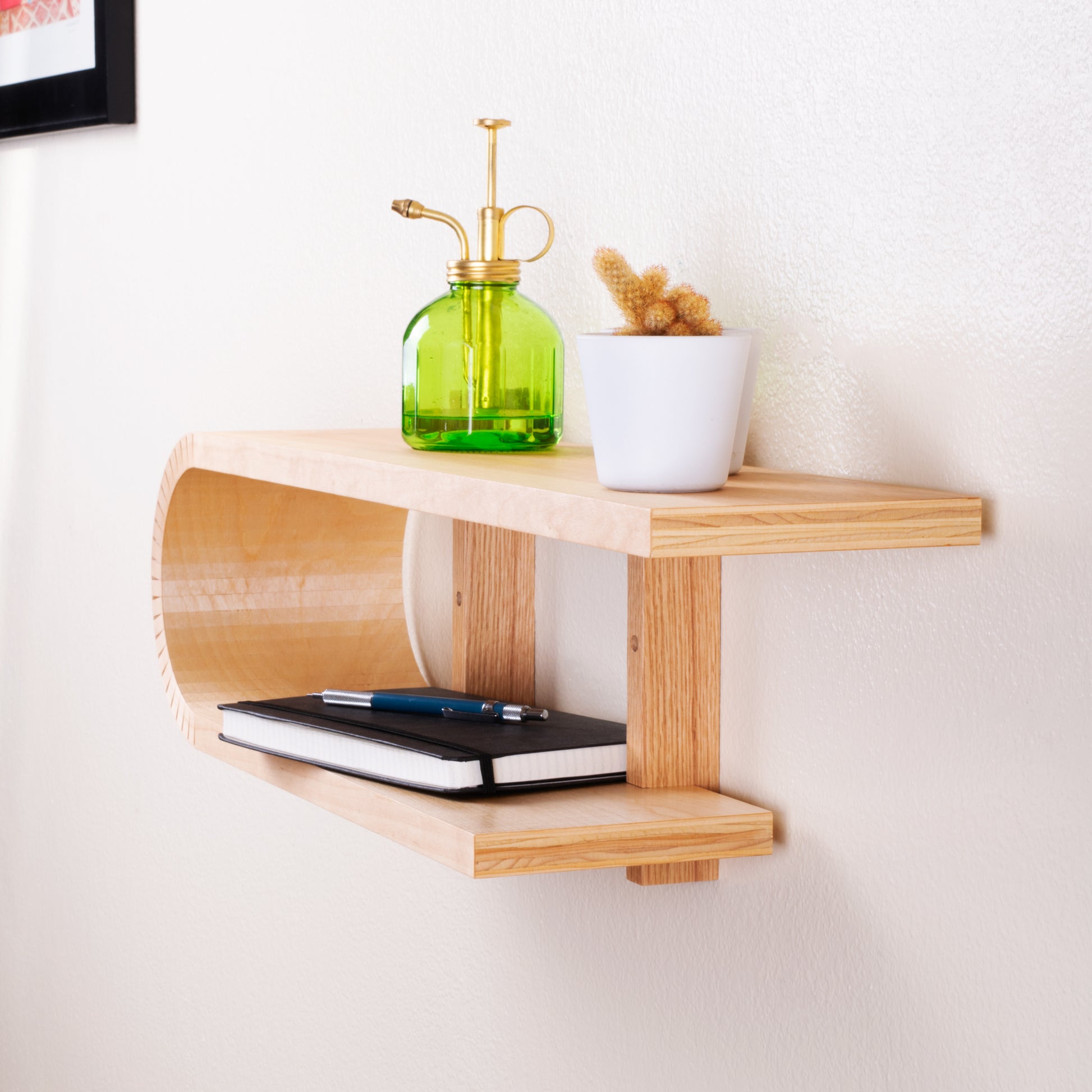 Combining elements of minimalism with the elegance of traditional woodworking, this kerf-bent wood shelf is the perfect addition to any room. Designed with both form and function in mind, this two-tiered design allows for more storage space while enhancing its natural beauty. This unique design also allows multiple mounting orientations. Constructed from American birch plywood with solid oak braces.